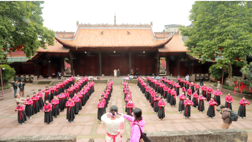资中文庙承载着深厚的儒家文化底蕴。在科普导师的引导下,学生们亲身体验了“正衣冠”“拜师礼”等传统仪式,感悟尊师重道、明礼修身的中华传统美德。随后,学生们参观孔子圣迹,聆听科普导师生动讲述孔子生平事迹、儒家思想精髓,结合历史文物与场景复原,系统了解儒家文化对中华文明的深远影响。