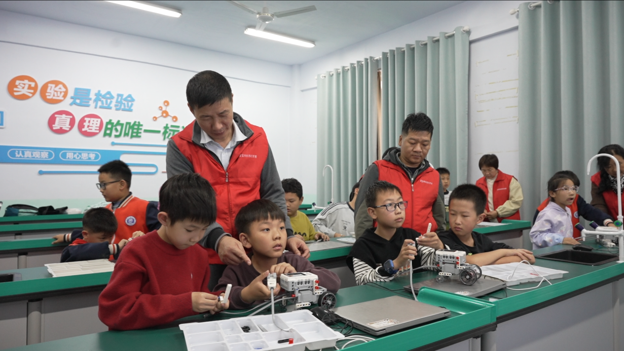 志愿者带领学生动手制作智能车辆模型,从乐高机械组装到科学装置搭建,孩子们在志愿者的耐心指导下,一步步探索科技奥秘。