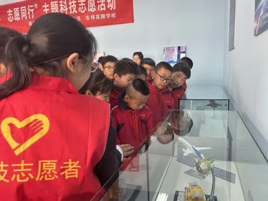 ▲原平市吉祥花园社区特色科技馆组织志愿者为学生讲解科技馆展品