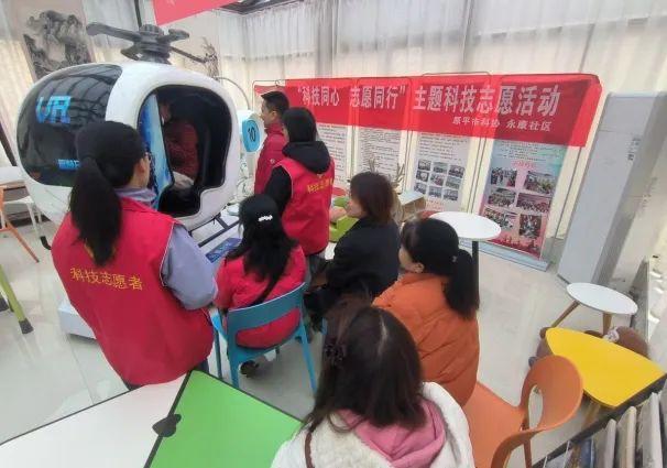▲原平市永康社区科技馆组织志愿者引导居民参观体验科技产品