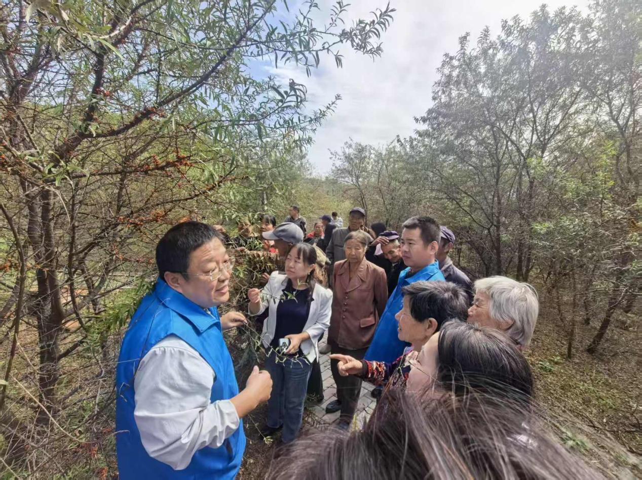 培训结束后,专家一行前往岚县沙棘科普资源圃进行实地指导。在现场,王老师一边指着挂果的植株讲解疏密修剪技巧,一边示范如何精准判断果实成熟度。他针对沙棘种植中的土壤改良、病虫害绿色防控,以及采收后的初步分拣等关键环节,结合资源圃实际情况细致指导,还当场解答农户提出的储存难题,让实用技术快速落地。