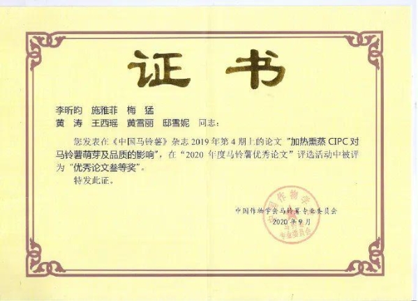 硕士研究生李昕昀等创作的马铃薯贮藏研究文章获“中国马铃薯优秀论文”