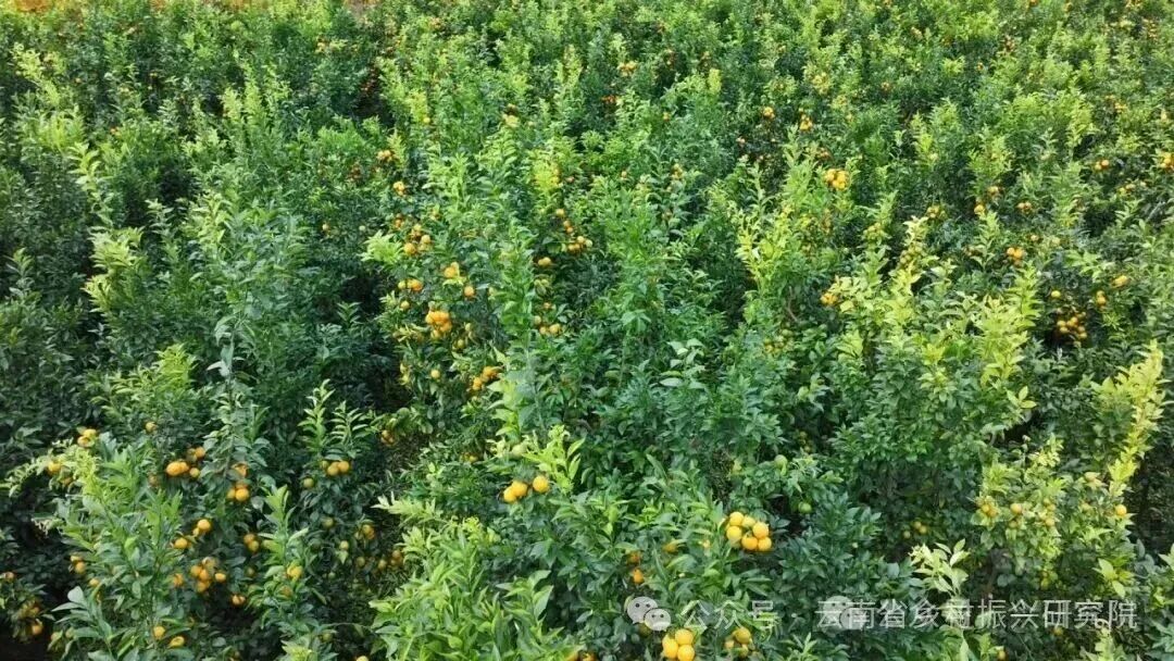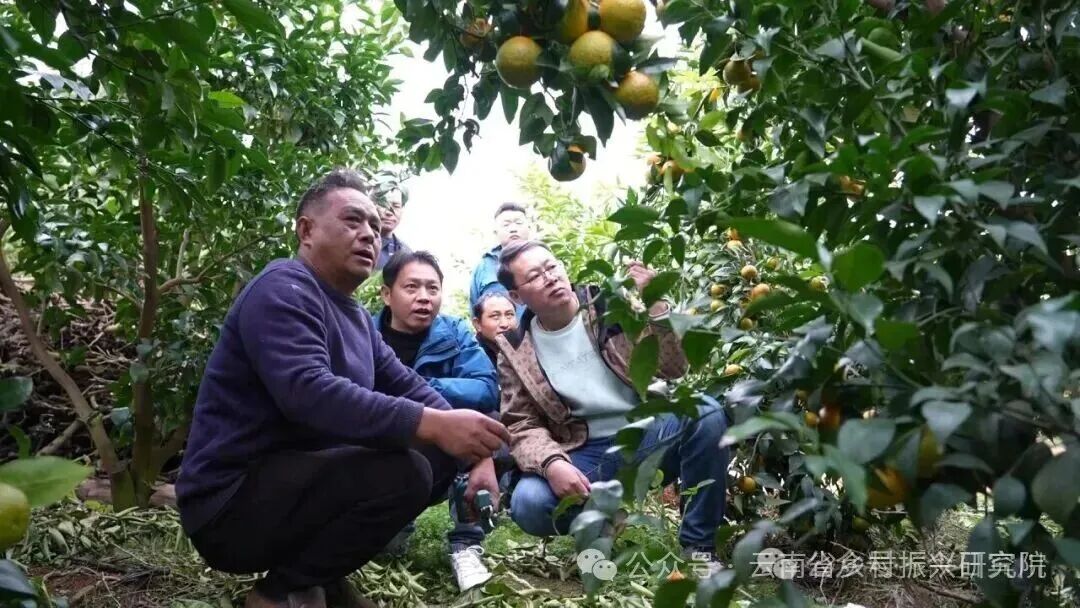在宾川县鸡足山镇松树龙村一个柑桔种植园内,即将成熟的沃柑硕果累累,丰收在望。柑橘科技小院的专家正在查看长势,并给种植户进行柑桔成熟期的管理指导。