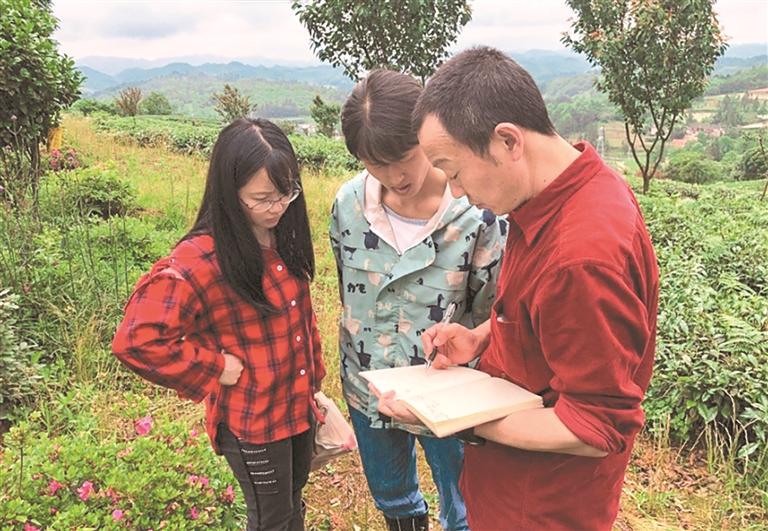贵州清镇茶叶科技小院首席专家、贵州大学绿色农药全国重点实验室副主任金林红(右一)和团队在茶山收集数据。