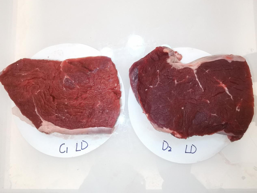 图3 宰前30天肉牛饲粮添加包被β-丙氨酸改善宰后牛肉品质(C1添加组优质肉,D2对照组DFD肉)