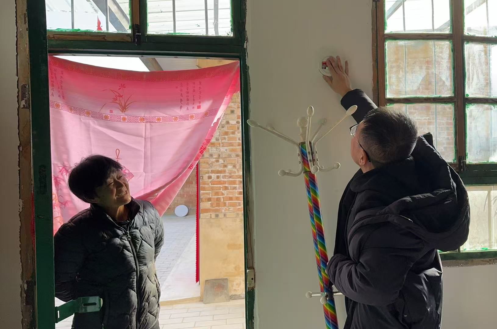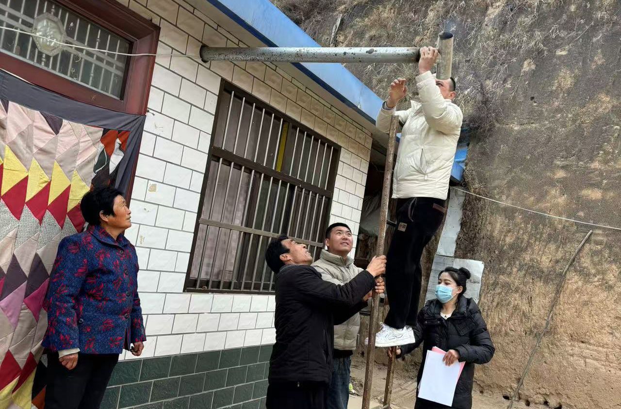 驻村工作队队员为群众安装烟囱。