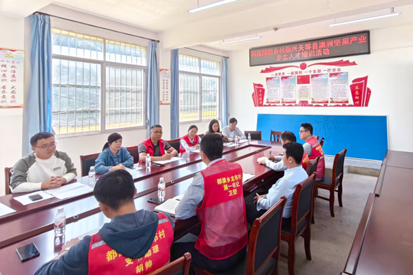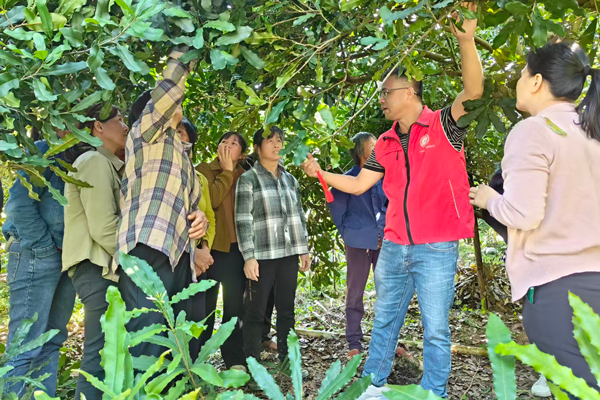 活动中,广西南亚热带农业科学研究所副所长覃振师带领的坚果专家团队,先以集中培训的形式,向村民讲解了澳洲坚果的市场前景与科学栽培技术要点。培训结束后,团队深入种植基地开设“地头课堂”,手把手传授果树修剪、精准施肥、病虫害绿色防控等关键技术,现场解答农户生产难题。